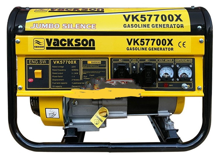 این ژنراتور برق تحتعنوان مدل «VACKSON VK57700E» عرضه شده است. این موتور برق انرژی موردنیاز خود را از طریق احتراق بنزین تامین میکند. مخزن سوخت بنزین این محصول حجمی برابر با 15 لیتر دارد. موتوری که از این سوخت انرژی الکتریکی تولید میکند، از نوع چهارزمانه است و قدرتی معادل 7 اسب بخار دارد. ظرفیت این موتور 210 سیسی است. این موتور تکسیلندری به کمک جریان هوا خنک میشود و صدای 68 دسیبلی تولید میکند. با کمک این محصول میتوانید برق AC و DC موردنیاز دستگاههای برقی خود را تامین کنید. سیم پیچی موتور برقهای واکسون 100% از مس میباشد . توان این ژنراتور 3200 وات است و از طریق دو پریز درپوشدار برق AC را در اختیار کاربر قرار میدهد. این برق ولتاژی برابر با 220 ولت دارد. همچنین برق DC خروجی نیز با ولتاژی برابر 12 ولت از شدتجریانی 8.3 آمپری برخوردار است. این محصول وزن مناسبی دارد که به راحتی قابل جا به جای است.
