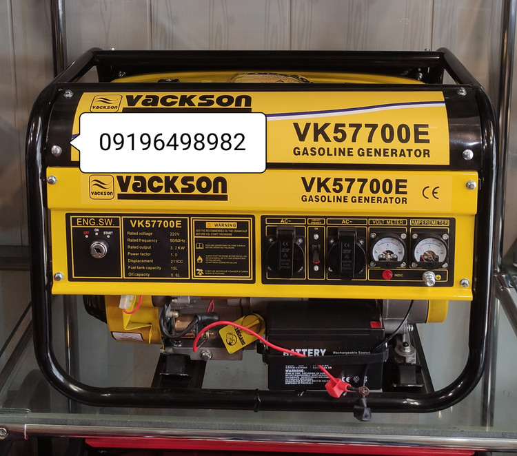 این ژنراتور برق تحتعنوان مدل «VACKSON VK57700E» عرضه شده است. این موتور برق انرژی موردنیاز خود را از طریق احتراق بنزین تامین میکند. مخزن سوخت بنزین این محصول حجمی برابر با 15 لیتر دارد. موتوری که از این سوخت انرژی الکتریکی تولید میکند، از نوع چهارزمانه است و قدرتی معادل 7 اسب بخار دارد. ظرفیت این موتور 210 سیسی است. این موتور تکسیلندری به کمک جریان هوا خنک میشود و صدای 68 دسیبلی تولید میکند. با کمک این محصول میتوانید برق AC و DC موردنیاز دستگاههای برقی خود را تامین کنید. سیم پیچی موتور برقهای واکسون 100% از مس میباشد . توان این ژنراتور 3200 وات است و از طریق دو پریز درپوشدار برق AC را در اختیار کاربر قرار میدهد. این برق ولتاژی برابر با 220 ولت دارد. همچنین برق DC خروجی نیز با ولتاژی برابر 12 ولت از شدتجریانی 8.3 آمپری برخوردار است. این محصول وزن مناسبی دارد که به راحتی قابل جا به جای است.