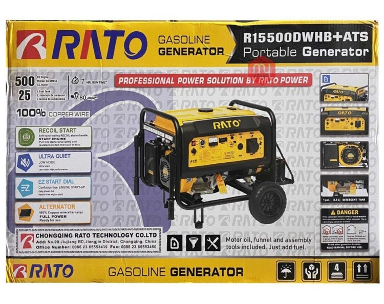 موتور برق راتو 8500 وات مدل +RATO R15500DWHB , از نوع موتور هواخنک, چهازمانه و تکفاز میباشد. نوع سوخت قابل استفاده بنزین است. فرکانس 50 هرتز است. دارای موتور قدرتمند به توان 19.5 اسب است که در حالت اوج به خروجی برق 8500 وات میرسد.دارای چرخ , دسته و باتری.
